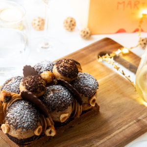 Depuis 2018, l’ascension de la famille Mariller est fulgurante. D’abord orientée vers le mono-produit avec son produit phare : une tarte pistache, framboise et vanille (aussi disponible en bûche !), Mariller les Saveurs repousse chaque année les limites de la créativité dès qu'il s'agit de bûche de Noël. La preuve déjà en 2023 avec la une bûche signature Bobosse. Si elle est de retour cette année, elle s'accompagne de 4 autres créations dont une qui retient notre attention ici : la bûche Paris-Brest. Une revisite de ce classique de la pâtisserie française au combo gagnant amande-noisette et choux.
