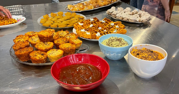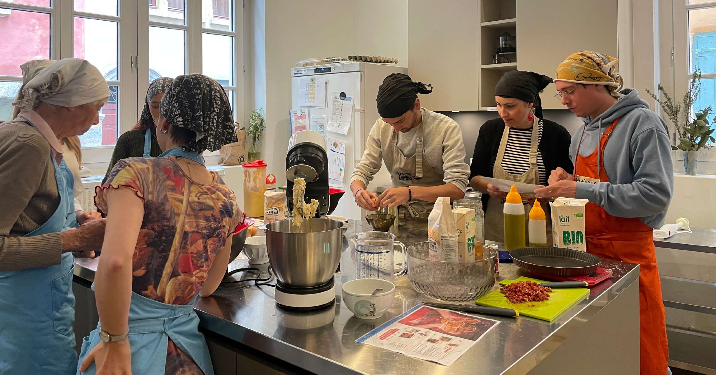 Ni une ni deux, les cuisiniers du jour se mettent au travail. Nos partenaires de la matinée réalisent de la fêta rôtie au miel, des muffins basques ou encore du hoummos de fève et de betterave. Les apprentis cuisiniers émincent, épluchent et mélangent tout en faisant connaissance. Et si certains sont encore étudiants à la recherche d’expériences nouvelles, d’autres sont là en voisins, habitant le quartier. Ensemble, ils effectuent des tâches du quotidien telles que la cuisine, la vaisselle et la mise en table.