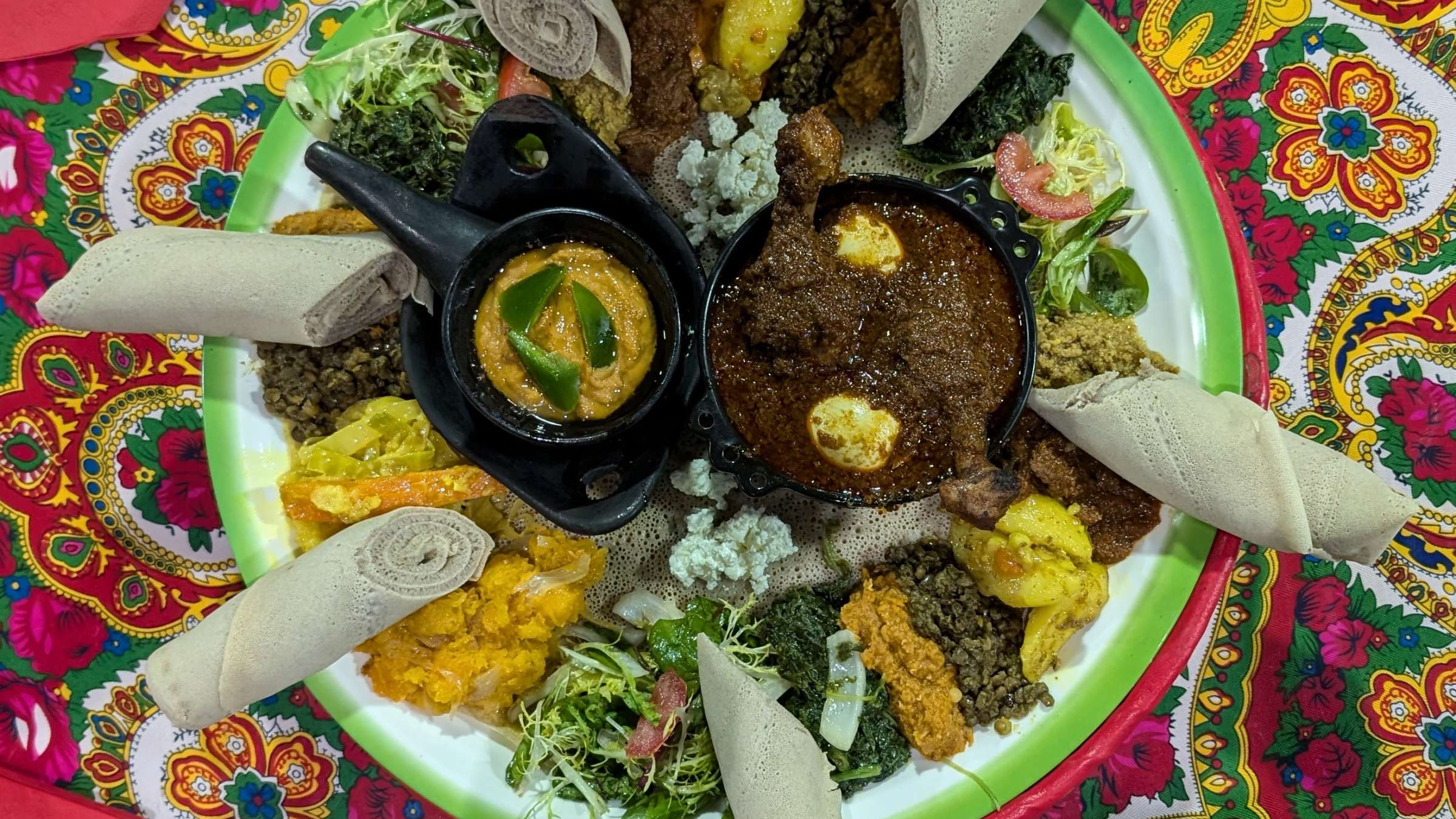 WassaïAt Samson Berhane’s restaurant, Ethiopian and Eritrean cuisine is served in a ‘mesob’, a traditional basket filled with delicacies such as azifa (lentil mousse), doro (chicken in a spicy sauce), shiro (chickpea flour pastry with spices) and chogera machalyo, a tripe dish, as a tip of the hat to Lyonnaise cuisine. Rather than cutlery, the food is eaten using injera, a flatbread made with teff flour.
