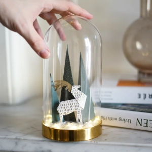 Dix janvier, spécialisée dans la papeterie japonaise, propose pour les fêtes de fin d'année une collection de créations de Noël. Parmi elles, une cloche en verre et métal doré abritant une charmante scène : un cerf blanc et doré se promène au sein d'une forêt de sapins au sol enneigé. Une guirlande lumineuse vient ajouter chaleur et douceur à cette belle scène. Chacun des éléments est réalisé à la main d'après la traditionnelle technique de l'origami.