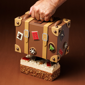 Après un entremets télécabine l'année dernière, voici la  toute nouvelle création en édition limitée signée Sébastien Bouillet : l'entremets Globe Trotter, à l'allure de valisette. Cette incroyable valise au chocolat noir et lait de 800g abrite une crème légère à la vanille, sur un crémeux et biscuit aux noix de Pécan, streusel aux amandes.